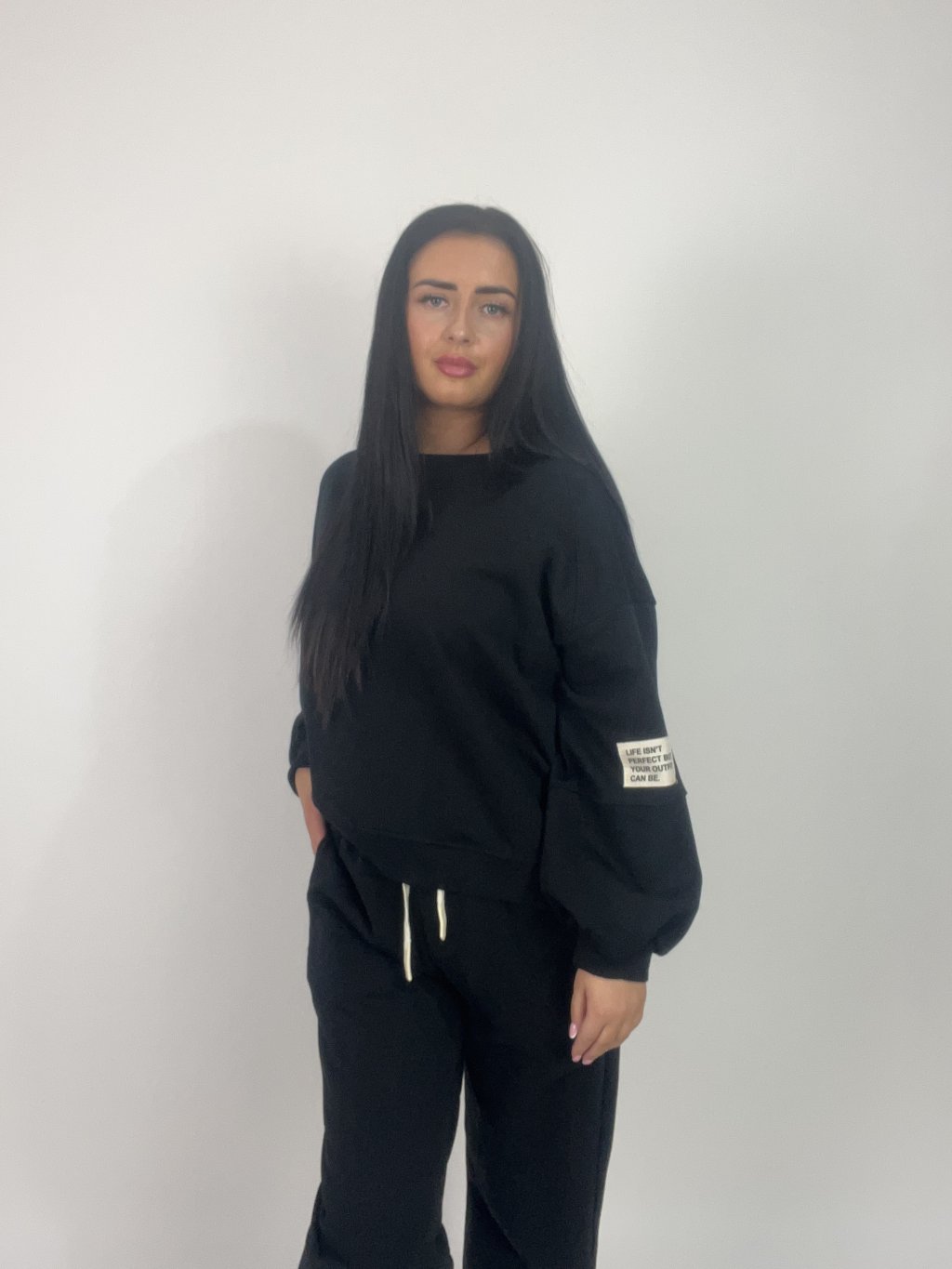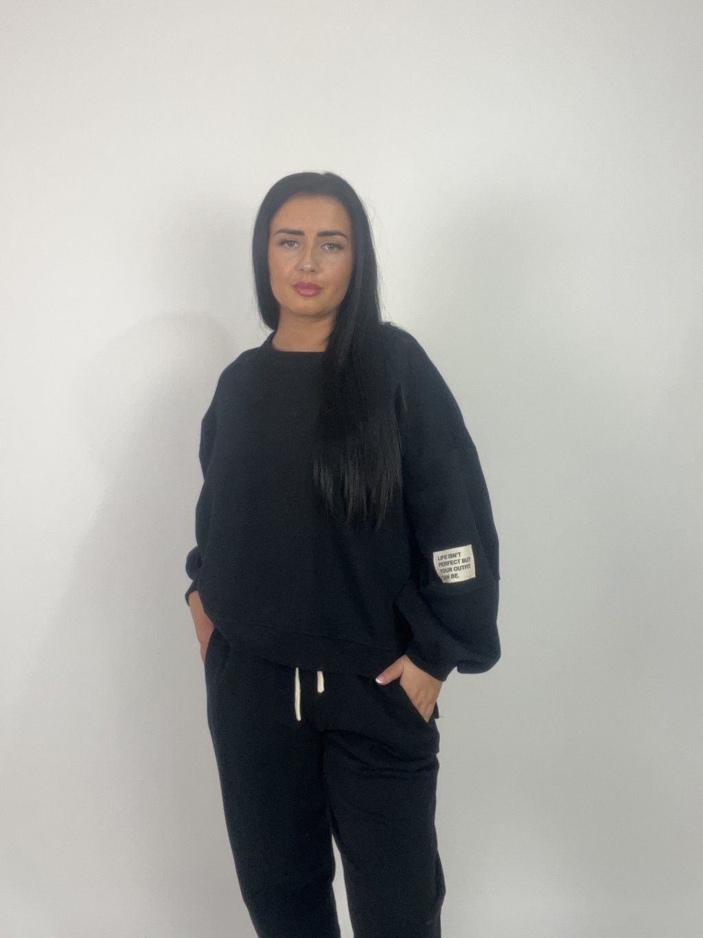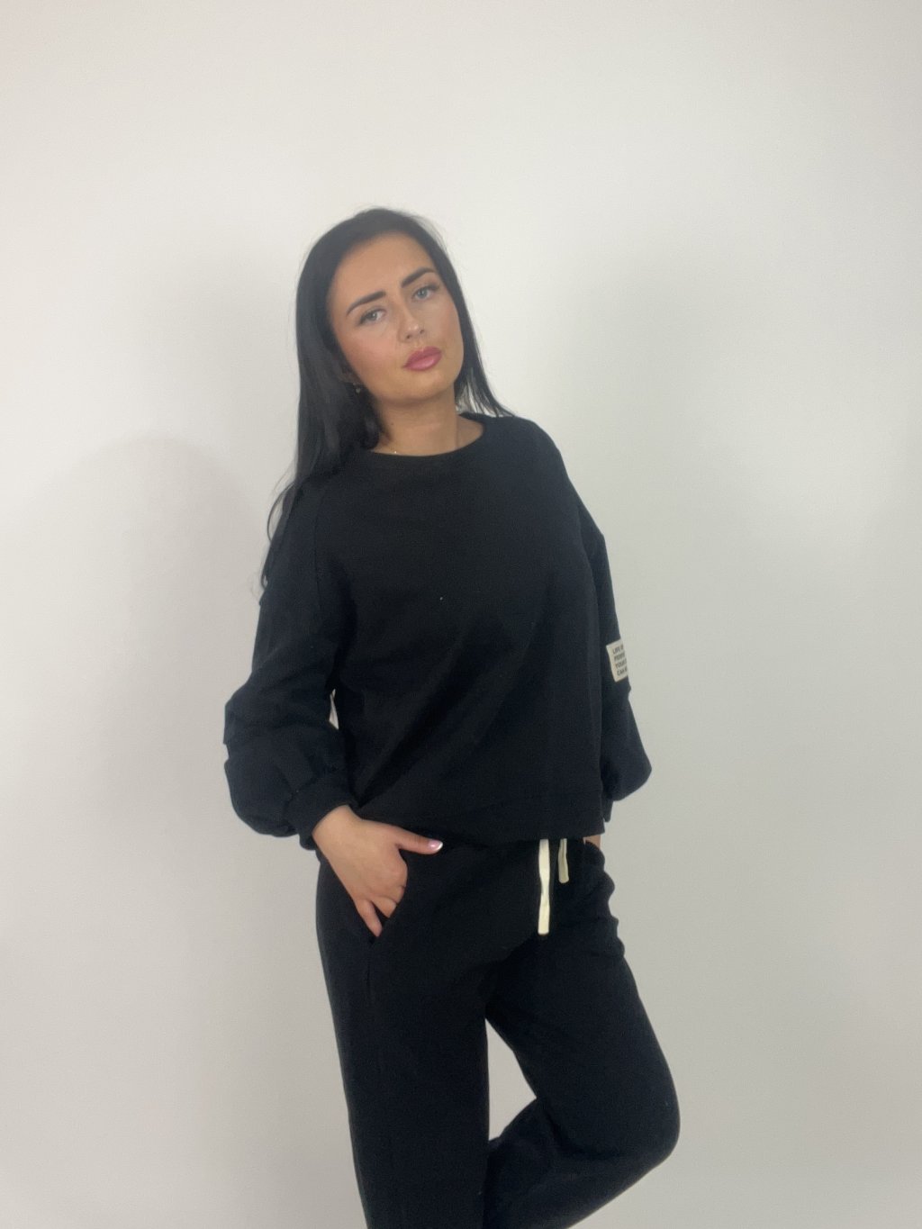 Dámska bavlnená tepláková súprava. Mikina je oversize, s okrúhlym výstrihom, padnutými plecami a dlhými, balónovými rukávmi, ozdobená nášivkou na rukáve. Tepláky majú bočné vrecka a sťahovanie v páse.