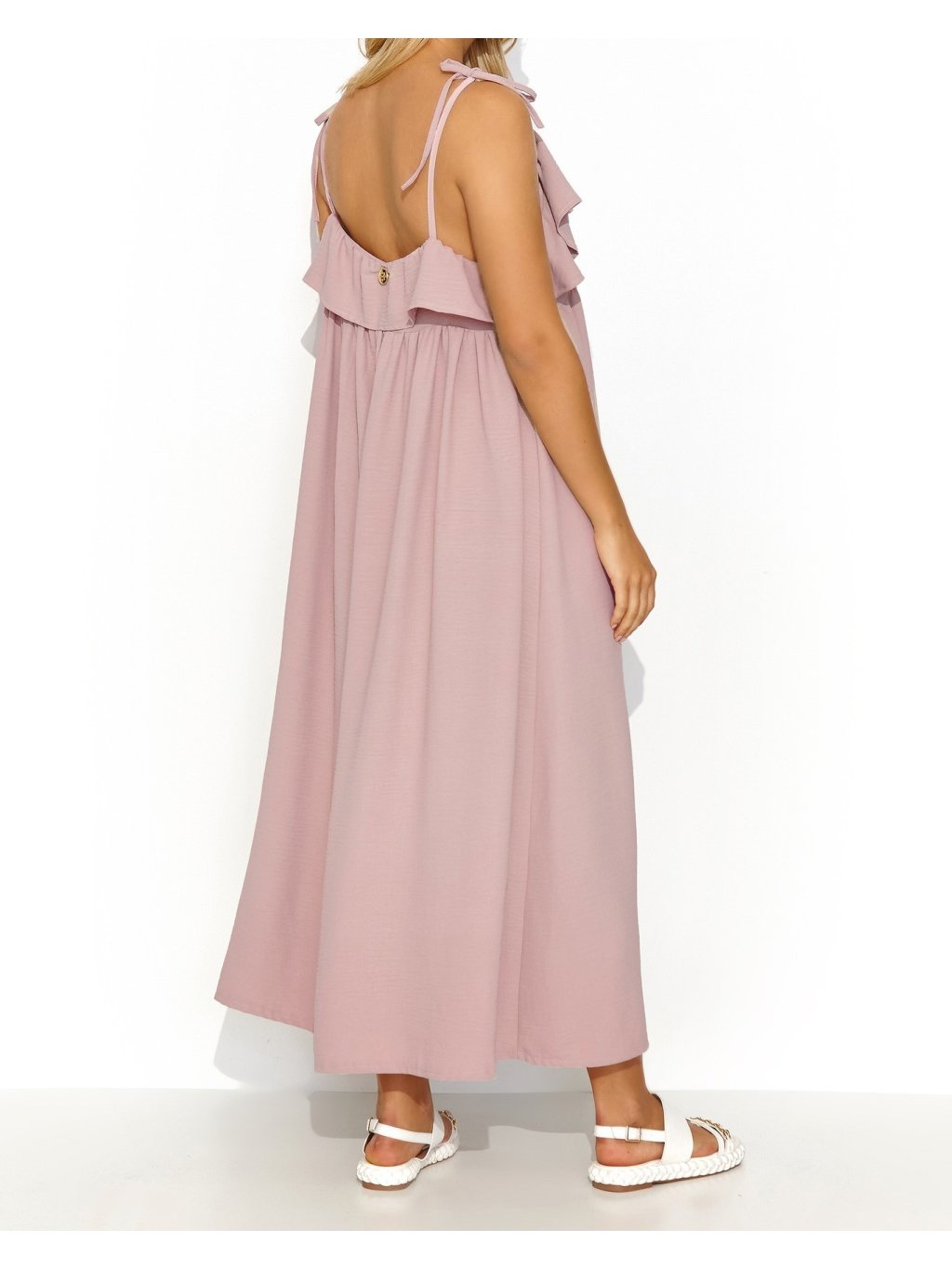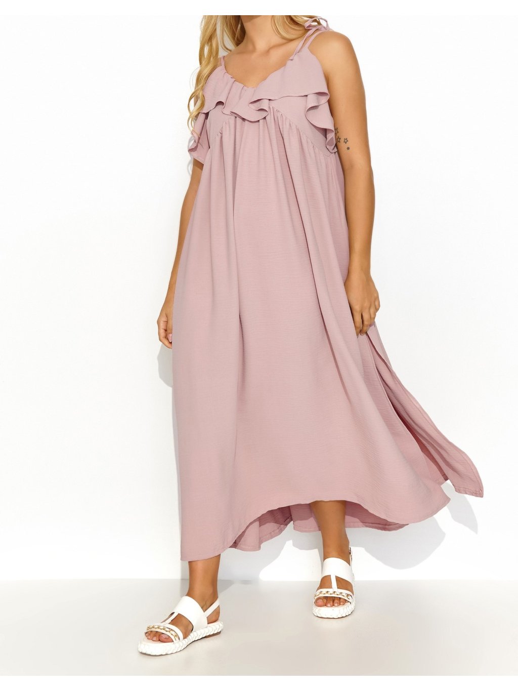 Dlhé oversize šaty s tenkými ramienkami zo splývavej a vzdušnej látky. Na zadnej strane šiat, na úrovni chrbta, je štýlová plaketa, ktorá dodáva celému stylingu jemnú žiaru. Volán, ktorý jemne zakrýva dekolt a zadnú časť šiat, zase dodáva zmyselný charakter. Spodná časť šiat je extrémne voľná, takže neobmedzuje v pohybe - môžete v nich ľahko tancovať, chodiť či hrať sa s deťmi. Kreácia je dostupná v módnych farebných variantoch ako: svetlo béžová, lila, baby pink, čierna, špinavá ružová a cappuccino. Náš styling vám nepochybne dodá šik štýl vo vašom rodnom meste, ako aj na rande s vaším milovaným partnerom alebo na prechádzke s rodinou a priateľmi.