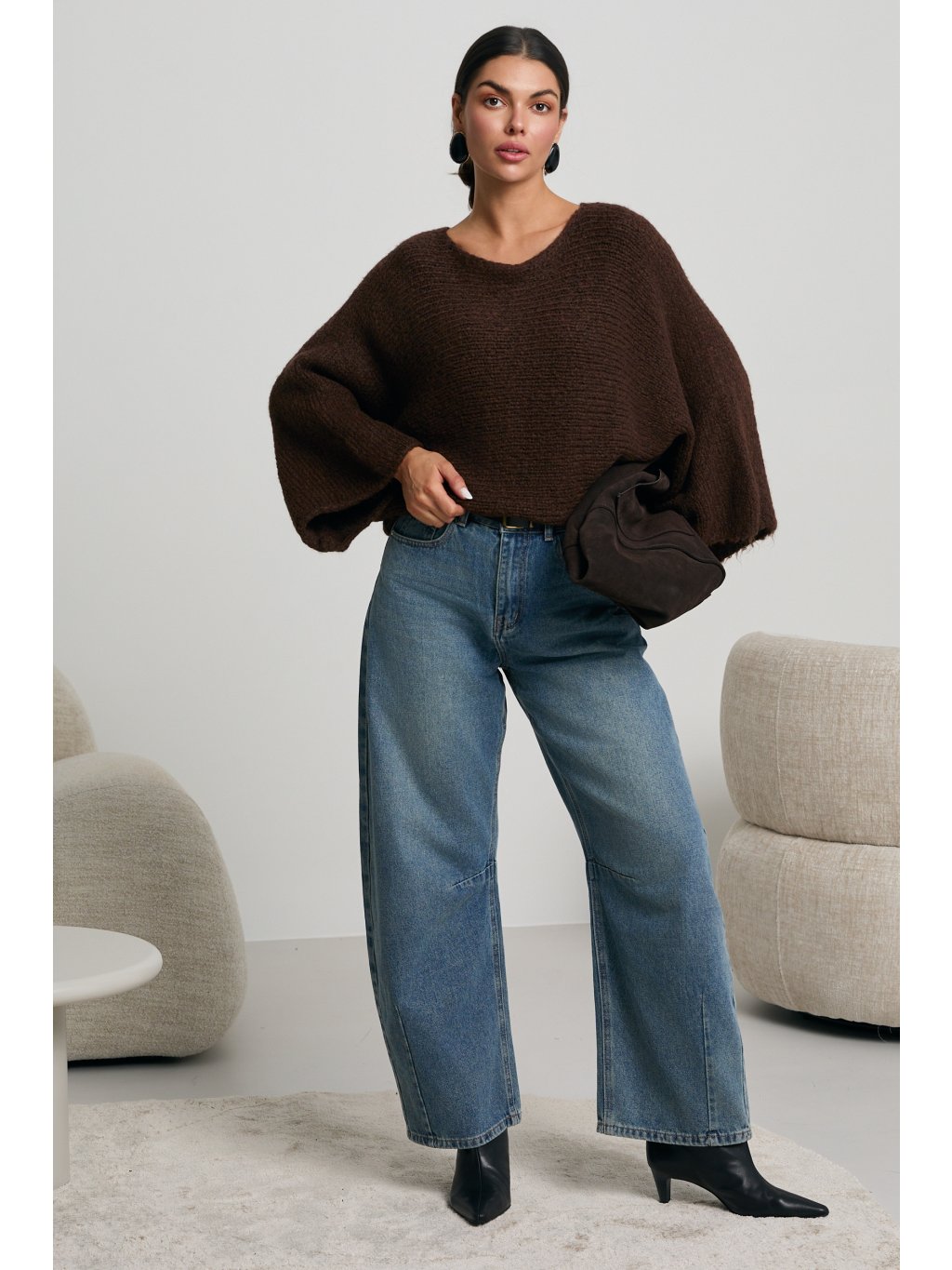Nadrozmerný sveter vyrobený z mäkkej, nadýchanej a na dotyk príjemnej pleteniny. Výstrih je zvýraznený výrazným zaväzovaním vzadu. Voľný strih, spadnuté ramená a široké rukávy zaisťujú pohodlie a slobodu pohybu. Tento dizajn, ktorý je ideálny na chladnejšie dni, v sebe spája ľahkosť, komfort a decentný ženský šarm.
