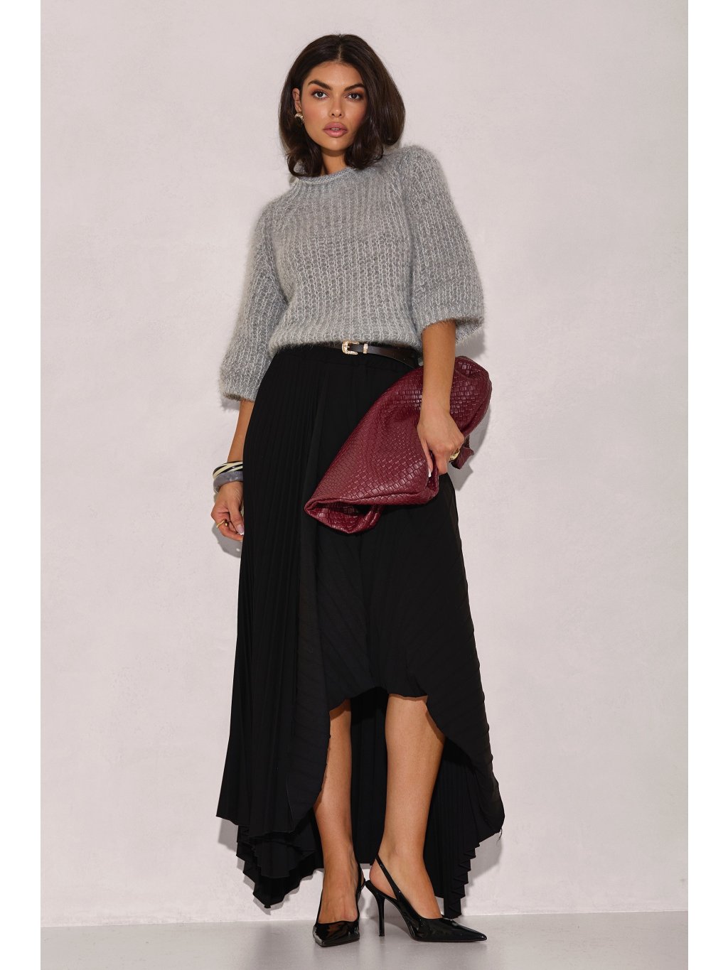 Husto pletený rolák zdobený drobnými flitrami, ktoré jemne odrážajú svetlo a dodávajú kúsku mierne žiarivý efekt. Textúra svetra je výrazná a strih je uvoľnený a pohodlný. Tento kúsok je ideálny na chladnejšie dni a hodí sa k bežným aj rafinovanejším outfitom. Krásne sa hodí k midi sukni, priliehavým nohaviciam alebo nohaviciam so širokými nohavicami a vytvára moderný a ležérny vzhľad.
